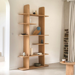 6 éléments en équilibre pour mettre en valeur livres et objets. D'une stabilité parfaite, cette étagère défie les lois de l'apesanteur. Chaque élément peut recevoir une tablette en verre réglable. Livrée montée, 6 tablettes en verre fournies. Chêne français 100% massif issu de forêts gérées durablement.