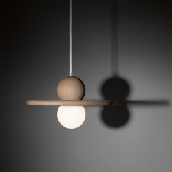 La suspension NÉBULEUSE est fournie avec platine en chêne et visserie pour fixation au plafond avec 150 cm de câble (cordon textile). Ampoule globe LED fournie (Warm white, 1000 lumens 2700 ° K, val. 72 W). En chêne 100 % massif.