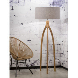 Petite lampe avec un abat-jour classique rond en lin sauvage clair. Le pied en trois branches est en bambou travaillé en courbes élégantes.