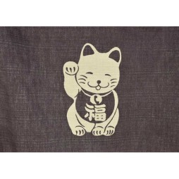 Noren japonais en coton fabriqué au Japon par Maeda Senko, ce modèle de 83 × 90 cm représente un maneki-neko, symbole de chance et prospérité.