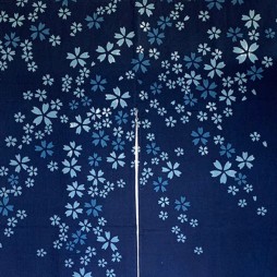 Noren japonais en coton teint à l’indigo, orné d’un motif de fleurs de cerisier. Ce modèle de 85 × 150 cm apporte une présence douce et naturelle inspirée du Japon.