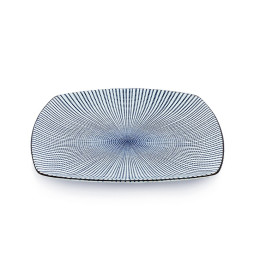 Assiette carrée en porcelaine traditionnelle du Japon, avec un motif de lignes bleues, rayonnant à partir du centre, croisant de fines lignes blanches concentriques, créant ainsi un bel effet visuel et élégant.