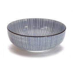 Saladier en porcelaine traditionnelle du Japon, avec un motif de lignes bleues, rayonnant à partir du centre, croisant de fines lignes blanches concentriques, créant ainsi un bel effet visuel et élégant. Cette grande céramique flattera vos salades et vos plats en leurs donnant l’écrin qui mettra en valeur le travail de votre cuisine.