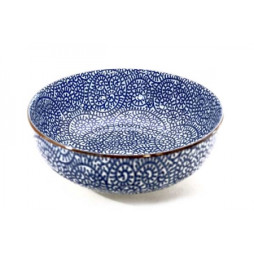 Saladier en porcelaine traditionnelle du Japon, avec un motif de lignes bleues, rayonnant à partir du centre, croisant de fines lignes blanches concentriques, créant ainsi un bel effet visuel et élégant. Cette grande céramique flattera vos salades et vos plats en leurs donnant l’écrin qui mettra en valeur le travail de votre cuisine.