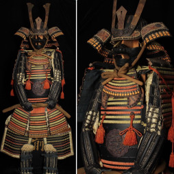 Une armure japonaise en laque noire (yoroi) 鎧 avec des cordons verts et orange, un ourlet multicolore et jaune, et une cuirasse en deux parties ornée en relief d’un dragon (kuro’urushinuri iroiro’ito kiiro’suso nimaidô tôsei gusoku)