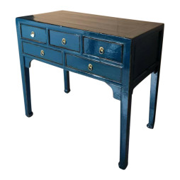 Console chinoise bleu turquoise en vieux pin, 2 tiroirs et une étagère