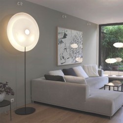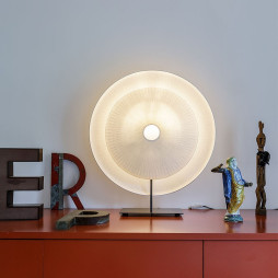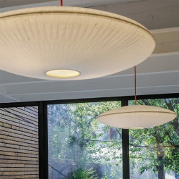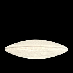 Luminaire lentiforme et généreux suspendu par des aimants à un câble tubulaire cristal. Disponible en trois dimensions: PM Ø 45 cm, MM Ø 62 cm et GM Ø 85 cm