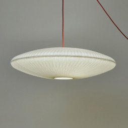 Un abat-jour lentiforme suspendu par un câble de tissu coloré, avec branchement au sol (pas besoin d'alimentation au plafond).