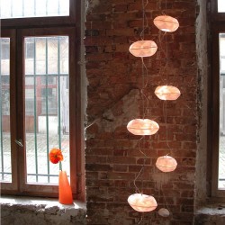 Les coques de papier sont maintenues sur un câble par des brins de rotin.