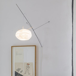 Papier japonais, rotin, câble acier, galet de marbre blanc, cordon électrique cristal, longueur 2m50. Branchement au sol, interrupteur à pied et branchement au plafond, le boitier de connexion est en papier japonais.