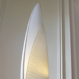 Applique en papier japonais moulé dont la structure en bandelettes s’inspire des brindilles d’un nid.
