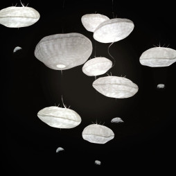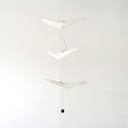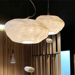 Entièrement réalisée à la main, la suspension CUMULUS est équipée d’un système monte et baisse, lesté par un galet de marbre blanc. Il est possible de de demander ce luminaire sans galet et même complètement fermés (envoyer un mail à : makoura@bluewin.ch).