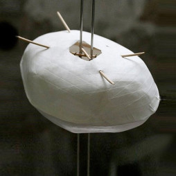 Une coupole dorée reflète la lumière projetée d’un petit nuage de papier froissé en apesanteur sur le dôme.