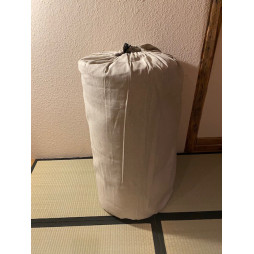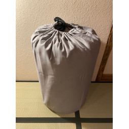Ces futons sont composé uniquement de coton recyclé en couches cardées. Ils sont roulés dans un sac écru ou de couleur. Sa grande dimension est confortable pour dormir ou pour pratiquer le yoga ou des massages au sol. Piquage manuel sans feutrines ou boutons.