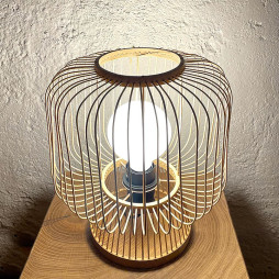 Lampe à poser en bambou tressé réversible, fabriquée à la main, au design ajouré et engagée pour un éclairage éthique et solidaire.