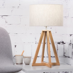 Petite lampe avec un abat-jour classique rond en lin sauvage clair. Le pied en trois branches est en bambou travaillé en courbes élégantes.