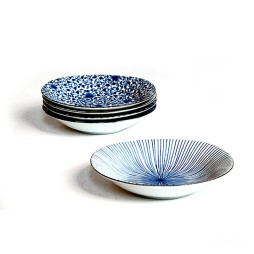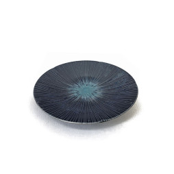 Assiette plate en porcelaine, décor géométrique stylisé de vagues bleues.
