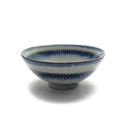 Bol en porcelaine blanche avec décor de lignes verticales bleues.