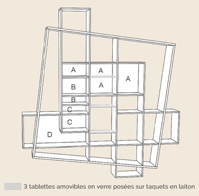 Sobre et décalée à la fois, la bibliothèque FRISCO offre toutes les possibilités de rangement d’une bibliothèque traditionnelle, l’originalité en plus: casiers plus ou moins hauts ou larges pour ranger, mettre en valeur beaux objets et livres.