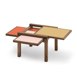 Table basse avec structure en iroko massif et trois plateaux réversibles et amovibles. Choisir une couleur pour les plateaux, (jusqu'à six coloris différents), dans la sélection Palette. Voir toutes les propositions de bois et de couleur sur: https://www.sculpturesjeux.com/fr/produits/catalogues/par3.html ou en magasin avec les échantillons de coloris.