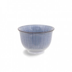 Bol à thé traditionnel, en porcelaine du Japon, avec un motif de lignes bleues, rayonnant à partir du centre, croisant de fines lignes blanches concentriques, créant ainsi un bel effet visuel et élégant.