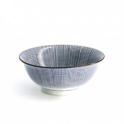 Grand bol à ramen en porcelaine traditionnelle du Japon, avec un motif de lignes bleues, rayonnant à partir du centre, croisant de fines lignes blanches concentriques, créant ainsi un bel effet visuel et élégant.