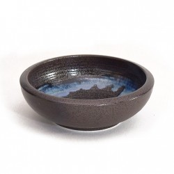 Petit saladier en grès émaillé brun, avec une trace épaisse d'émail bleu.
