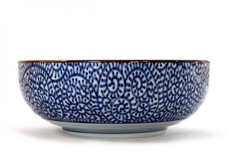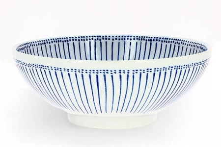 Saladier en porcelaine traditionnelle du Japon, avec un motif de lignes bleues, rayonnant à partir du centre, croisant de fines lignes blanches concentriques, créant ainsi un bel effet visuel et élégant. Cette grande céramique flattera vos salades et vos plats en leurs donnant l’écrin qui mettra en valeur le travail de votre cuisine.