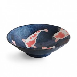 Grand bol ou saladier en porcelaine opaque émaillée bleu cobalt décoré des traditionnelles carpes (Koi) japonaises rouges.