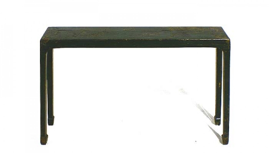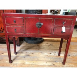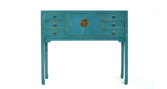 Console chinoise bleu turquoise en vieux pin, 2 tiroirs et une étagère