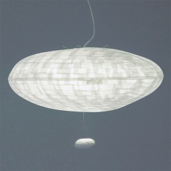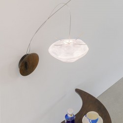 Luminaire lentiforme et généreux suspendu par des aimants à un câble tubulaire cristal. Disponible en trois dimensions: PM Ø 45 cm, MM Ø 62 cm et GM Ø 85 cm