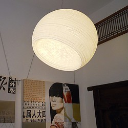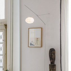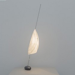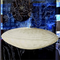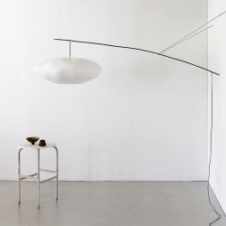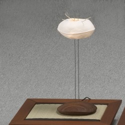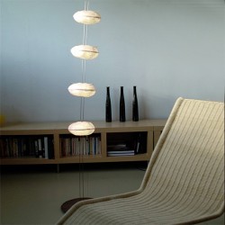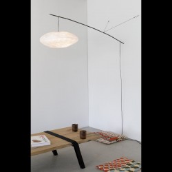 Papier japonais, rotin, câble acier, galet de marbre blanc, cordon électrique cristal, longueur 2m50. Branchement au sol, interrupteur à pied et branchement au plafond, le boitier de connexion est en papier japonais.