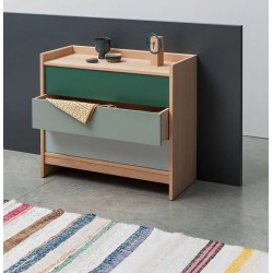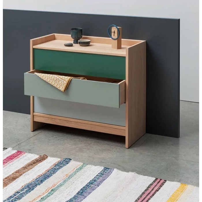 Grand rangement, faible encombrement pour la commode en bois massif BRIC : trois grands tiroirs permettent de ranger vêtements, livres, fournitures. Rehaussé par les débords des côtés et de l’arrière, le plateau devient un véritable présentoir pour de beaux objets. Les biseaux dans l’épaisseur du chêne massif viennent amincir la silhouette de ce meuble.