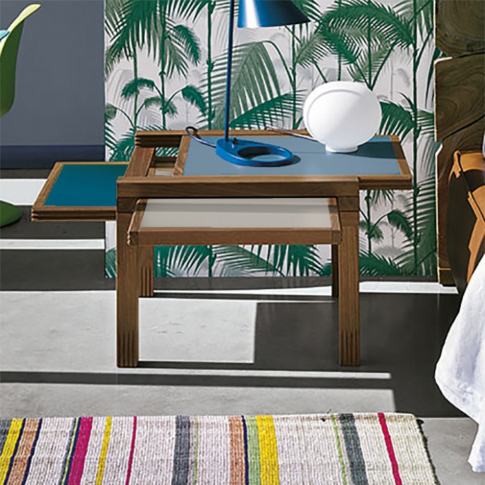 Table basse avec structure en iroko massif et trois plateaux réversibles et amovibles. Choisir une couleur pour les plateaux, (jusqu'à six coloris différents), dans la sélection Palette. Voir toutes les propositions de bois et de couleur sur: https://www.sculpturesjeux.com/fr/produits/catalogues/par3.html ou en magasin avec les échantillons de coloris.